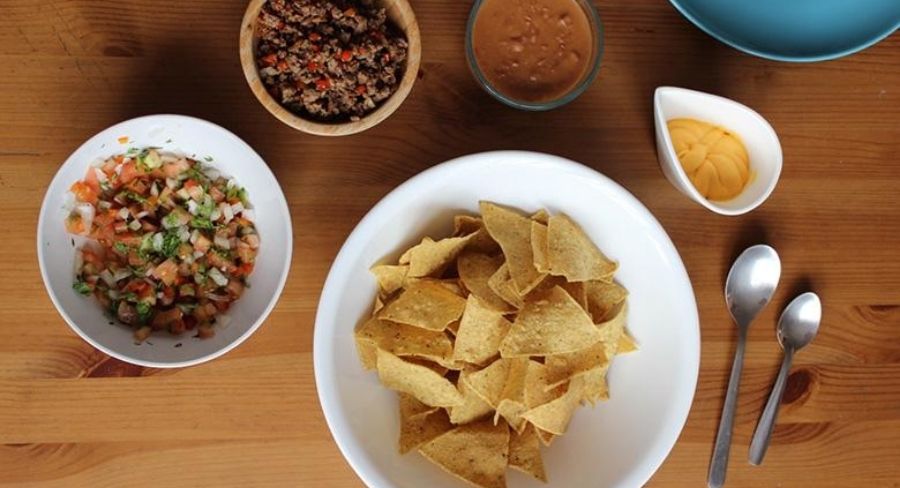 Para servir, ponemos en un recipiente de boca ancha los nachos y, empezamos a agregar todos los ingredientes poco a poco sobre estos. Servimos como haciendo círculos con la cuchara, para que no quede una torre de comida.