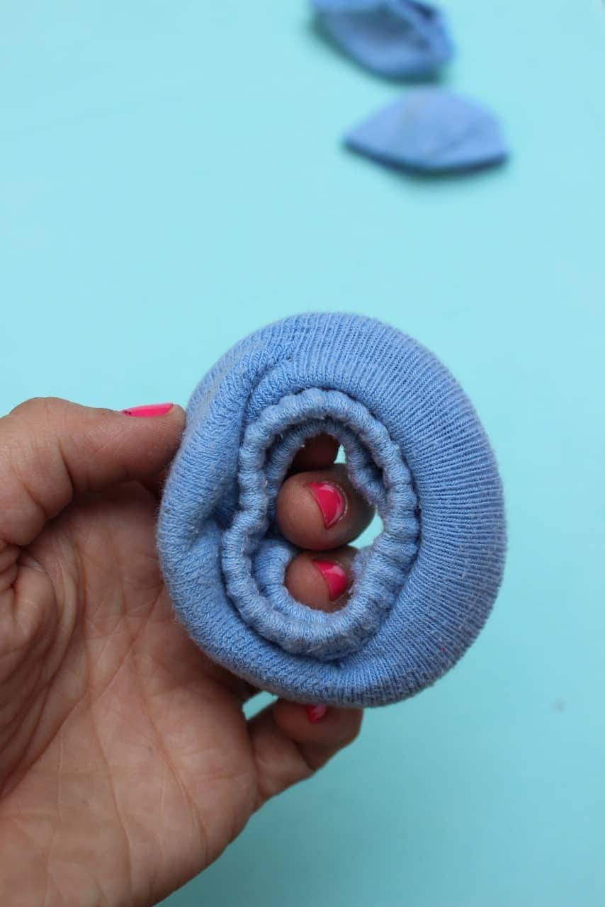 Voltea las medias, que lo de adentro quede hacia afuera, y enrolla. Si tienes medias del mismo color, para hacer donas más gruesas puedes meter una dentro de la otra antes de enrollar.