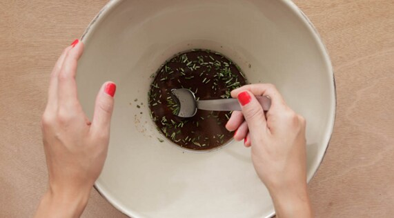 En un recipiente mezcla el aceite de coco y el romero. Agrega el azúcar.