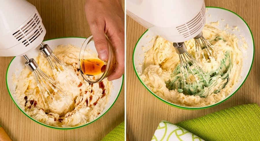 3. Agrega la leche y sigue batiendo hasta que notes que se esponje. Enseguida agrega la esencia de vainilla y los colorantes de comida que desees, así cada cupcake quedará con un color diferente. Este truco puedes utilizarlo en diversos tipos de postres.